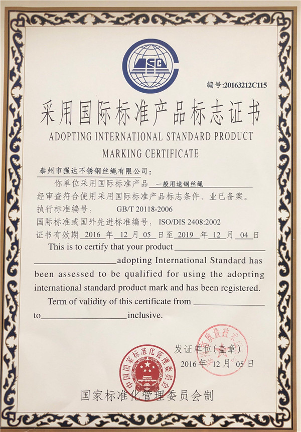泰州市強達不銹鋼絲繩有限公司位于江蘇興化市戴南經(jīng)濟開發(fā)區(qū),公司致力于不銹鋼絲繩產(chǎn)品生產(chǎn),立志成為“國內(nèi)技術(shù)標(biāo)桿型吊索具生產(chǎn)企業(yè)”。以此戰(zhàn)略思想指導(dǎo),公司堅決貫徹“質(zhì)量贏市場,管理增效益,誠信贏天下”的質(zhì)量方針。以完善的服務(wù)在國內(nèi)不銹鋼絲繩市場樹立良好的品牌形象。公司榮獲“江蘇省質(zhì)量信得過企業(yè)。 靈活的管理機制,經(jīng)驗豐富的